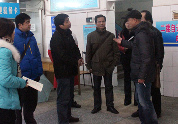 公司副经理郭睦庚(左三)一行检查开学前员工食堂运行情况