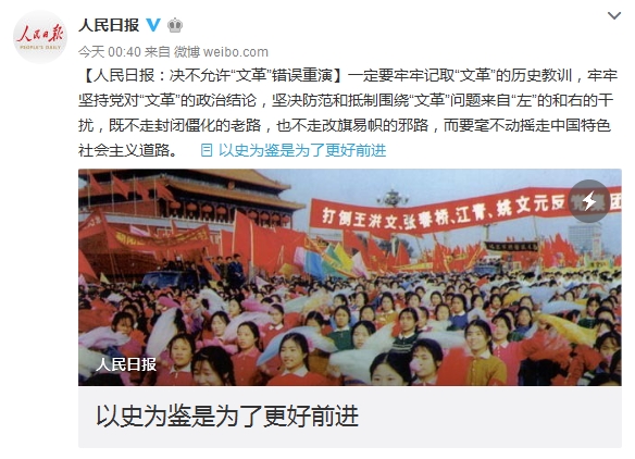 【人民日报:决不允许“文革”错误重演】一定要牢牢记取“文革”的历史教训,牢牢坚持党对“文革”的政治结论,坚决防范和抵制围绕“文革”问题来自“左”的和右的干扰,既不走封闭僵化的老路,也不走改旗易帜的...