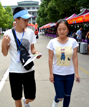 “同学您好,请问您是哪个专业的?有什么我可以帮忙的地方吗?”志愿者胡铭三对一位刚来报到的新生热情问道。